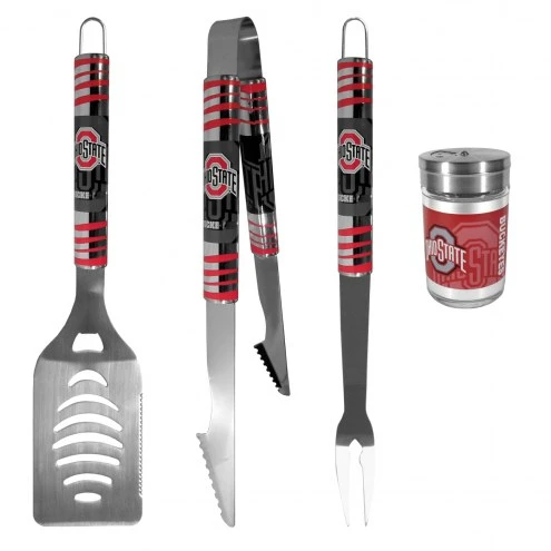 This Ohio State Buckeyes 3 Piece Tailgater BBQ Set and Season Shaker is a tailgater’s best friend. The colorful and large team graphics on each of the barbecue tools let’s everyone know you +are a fan! The set includes a spatula, tongs, and fork with the team logo proudly displayed on each tool. It also comes with a compact shaker with a twist top that closes off the holes at the top, making it perfect for travel preventing those messy spills. The shaker has wide holes perfect for keeping your pepper seeds or cheese toppings.