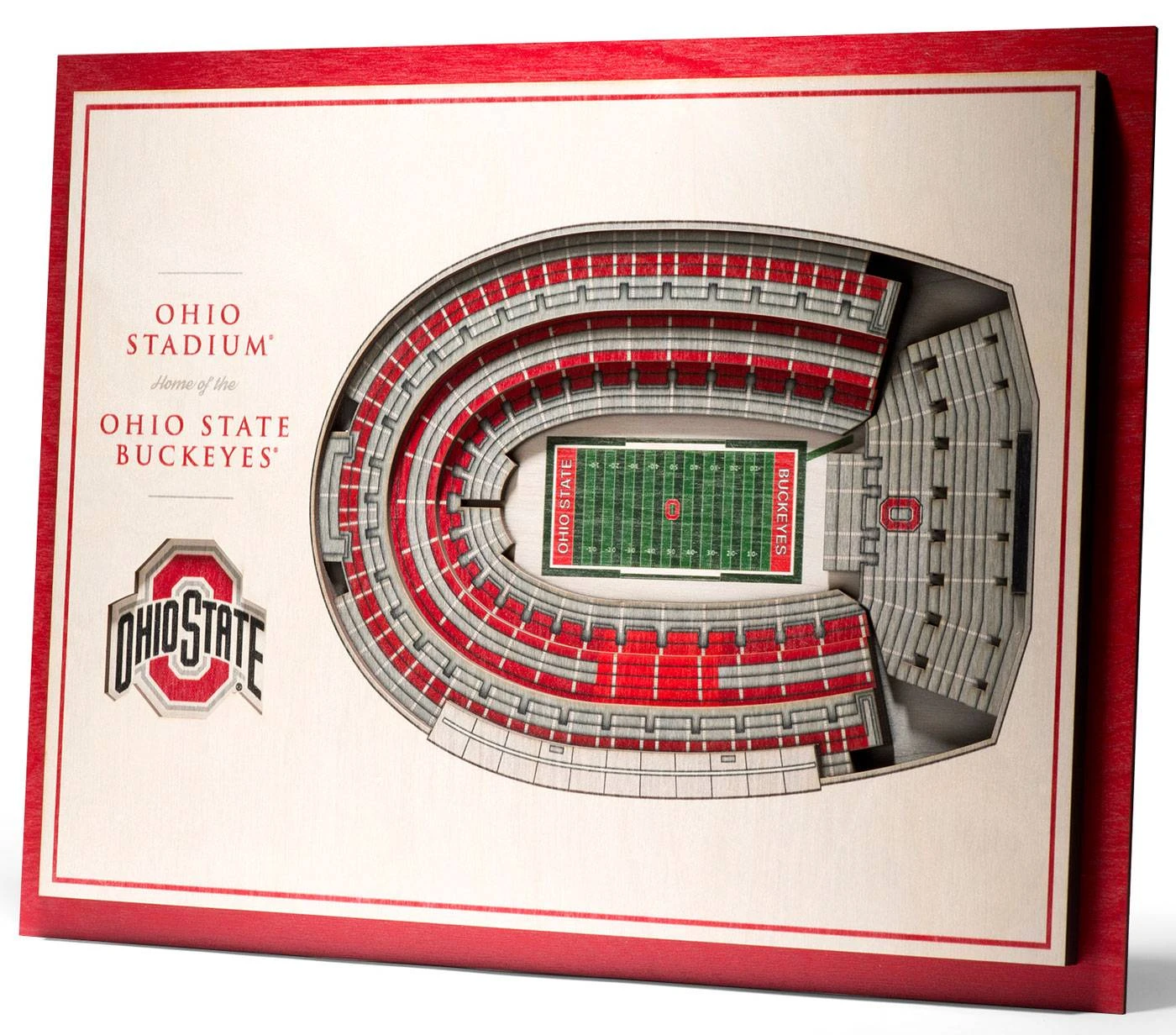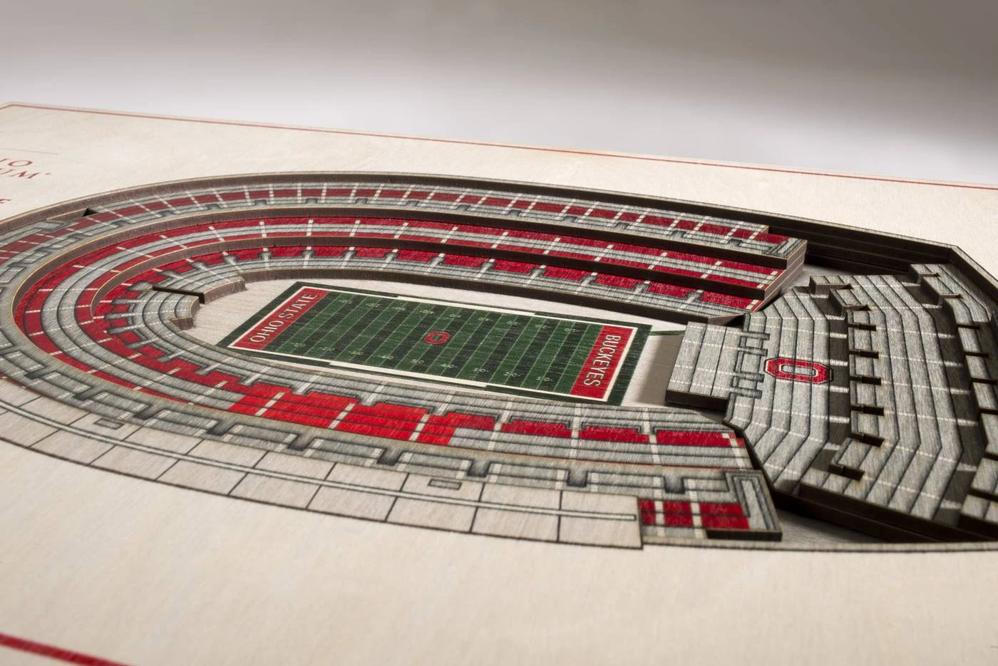 The Ohio State Buckeyes 5-Layer StadiumViews 3D Wall Art adds dimension to your decor. YouTheFan takes five layers of real wood, each 1/8″ thick, and hand assemble them in Indiana to create a +three-dimensional work of stadium art that commands attention. The light weight and the pre-cut notch on the back make this 3D wall decor easy to hang. The entire piece is edged in the official team color to create a high-contrast framing effect. The 5-Layer StadiumViews 3D Wall Art is an essential accessory for any fan cave and makes a great gift.