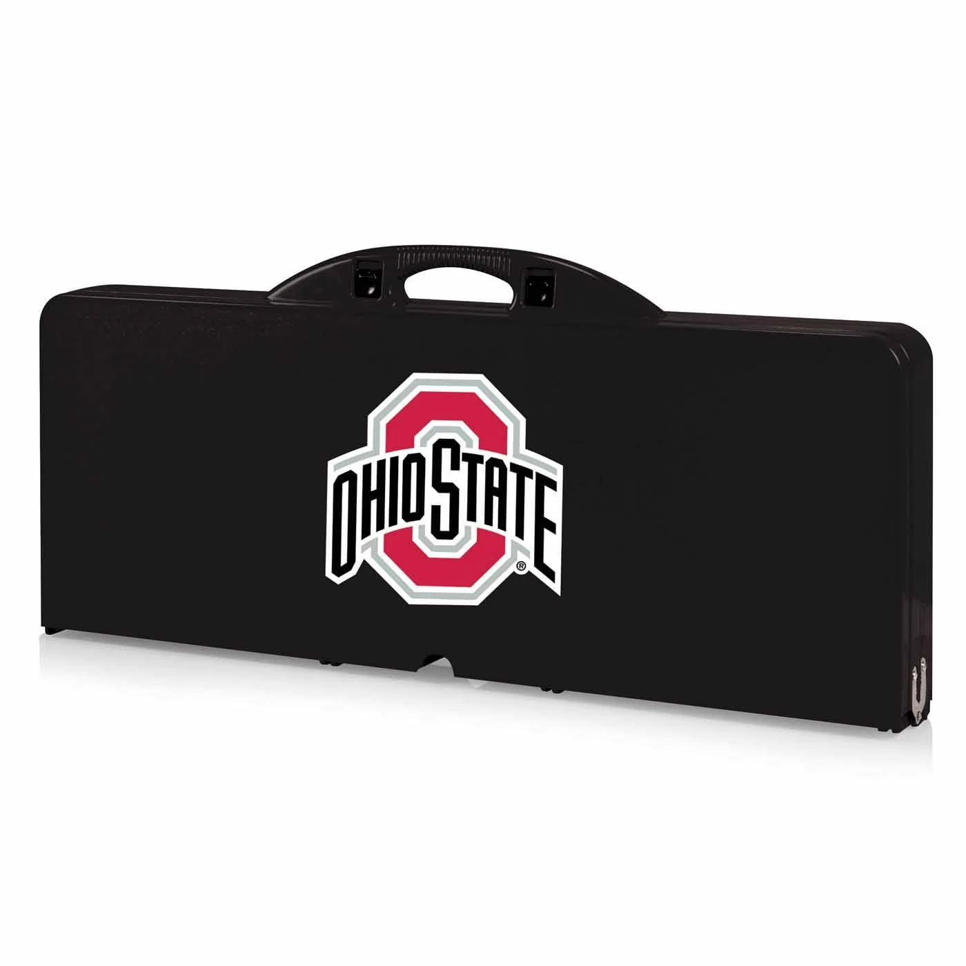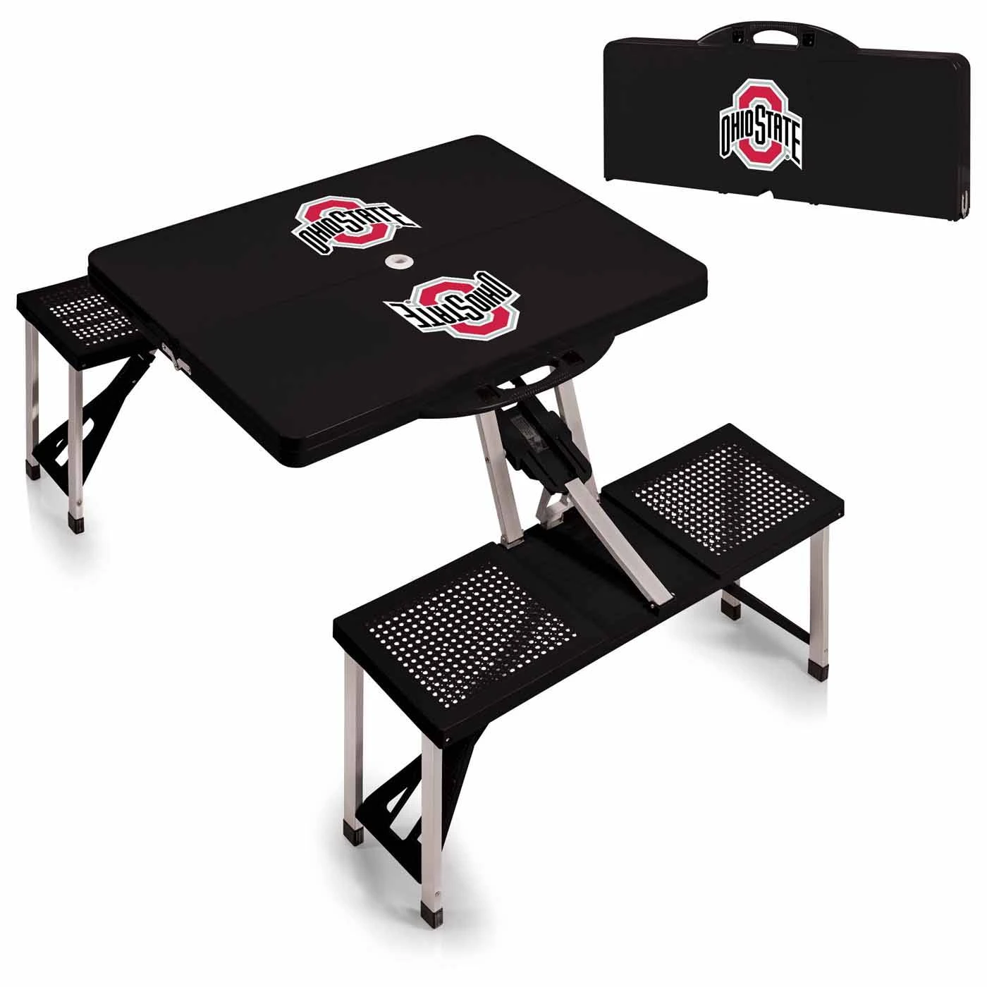 Bring the picnic to the tailgate with the Ohio State Buckeyes Black Sports Folding Picnic Table. This table features legs and seats that conveniently compact into a portable and storable form. Just slide +it in the car and unfold it for the tailgate. Although it’s portable, the Picnic Time table does not lack in durability. The aluminum alloy frame is tough and the molded polypropylene seats have a maximum weight capacity of 250 lbs. per seat. With the hole in the center of the table to accommodate a beach umbrella, you can make it a true picnic. Digitally printed team logos make this a must for any serious fan and tailgater.
