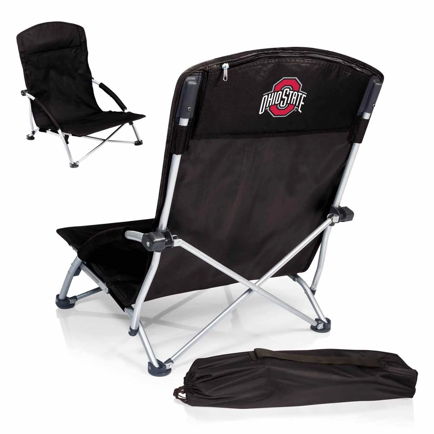 Put your feet in the sand and kick back in the Ohio State Buckeyes Black Tranquility Beach Chair! This portable chair from Picnic Time has an inward-folding compact design, perfect for trips to +the beach. With its powder-coated steel frame, polyester seat and armrests, this high quality chair is more durable than your typical beach chair.