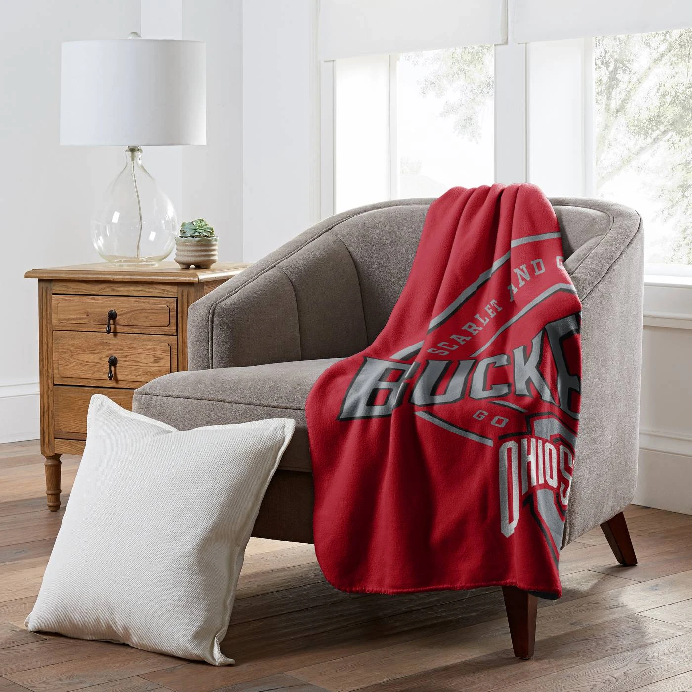 Campaign for your favorite team with the Ohio State Buckeyes Campaign Fleece Throw Blanket by The Northwest. It’s the perfect gift or accessory for any fan. Featuring a bold team name diagonally across +the throw above the team logo in front of a circle design, this 50″ x 60″ fleece is sure to stand out. With whipstitch around all the edges, this soft throw will keep you warm on the couch or in the bedroom while watching your favorite team play. 100% Polyester.