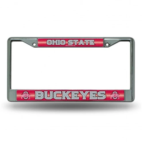 Now you can really stand out on the streets with the Ohio State Buckeyes Chrome Glitter License Plate Frame! With a glitter decal insert, light radiates out from the center of the insert +to the edges to highlight your favorite team. The impact resistant chrome finish metal frame is made to withstand the abuse of the road. Pre-drilled holes make mounting easy.