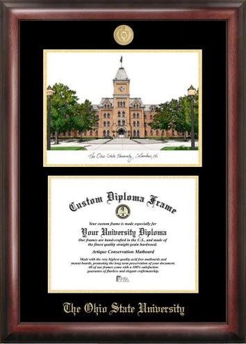 Celebrate your achievements with the Ohio State Buckeyes Gold Embossed Diploma Frame with Campus Images Lithograph. The gold embossed borders and imprinted university name combine with a satin mahogany frame for one stunning +piece of art. With a beautiful campus image to complement your diploma, you’ll always be able to reflect on your college memories. Everything you need to insert your document and hang the frame is included.