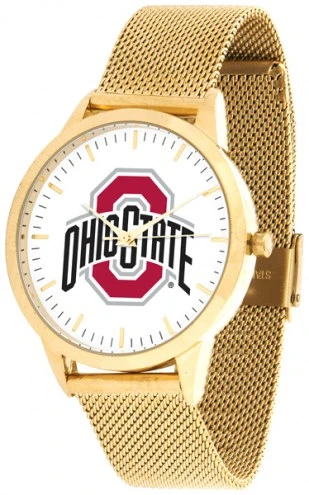 Combine your passion for fashion and sports with the Ohio State Buckeyes Gold Mesh Statement Watch! The Sleek, understated, full-sized dial, paired with a clean, silhouette frame, is the essence of contemporary design. +Created as a mesh of both men’s and women’s styling, this is truly a statement timepiece.