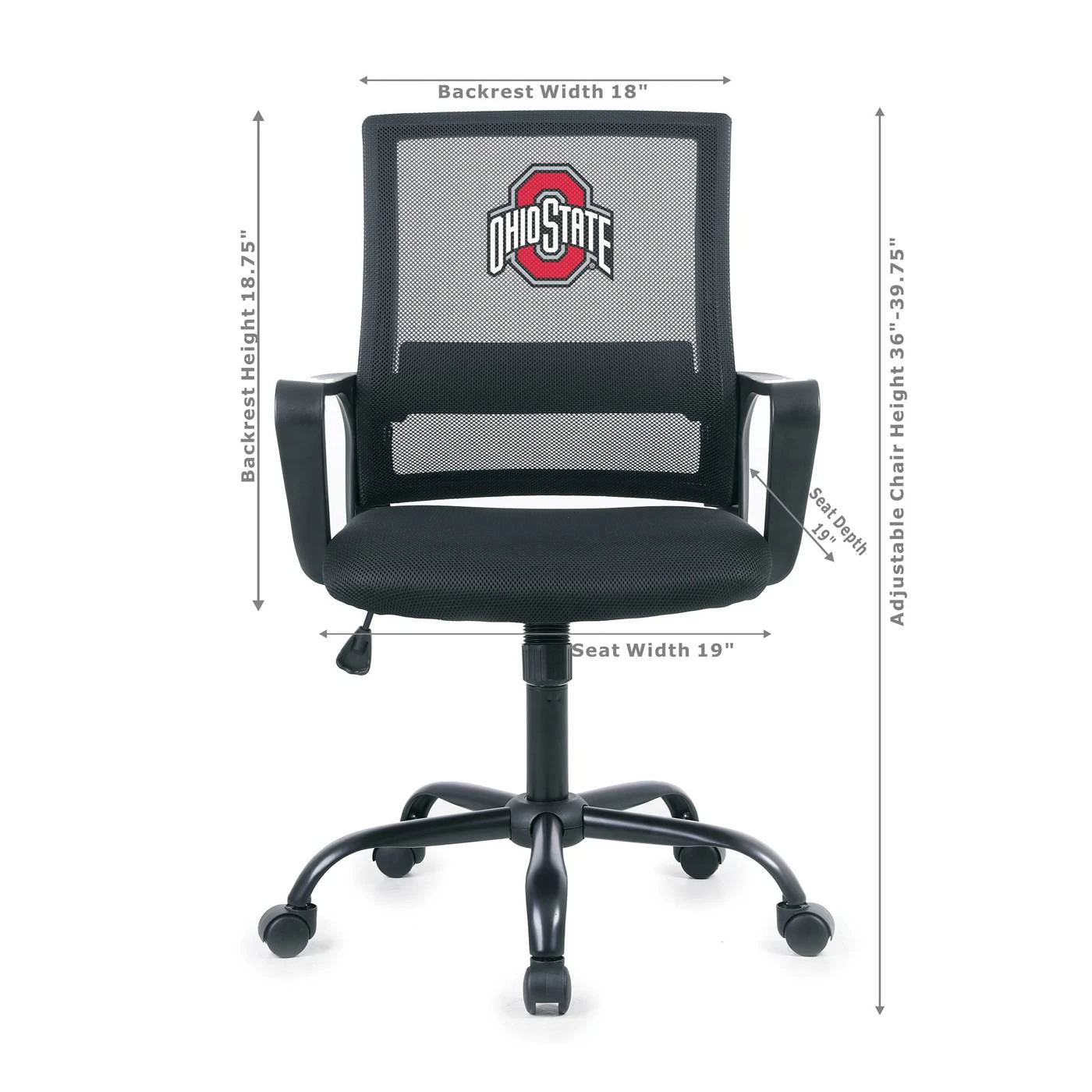 Sport your Ohio State Buckeyes Mesh Back Office Chair everyday at work. Great for your home office or corporate workspace.Seat has mesh fabric for comfort and long hours of work. Sturdy armrest, butterfly +mechanism, solid steel base with castors make this a chair to last. 275 pound weight limit. All materials meet with BIFA standards.