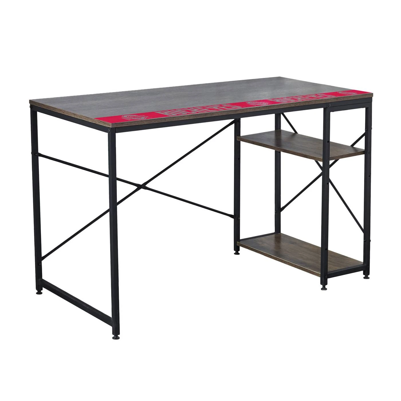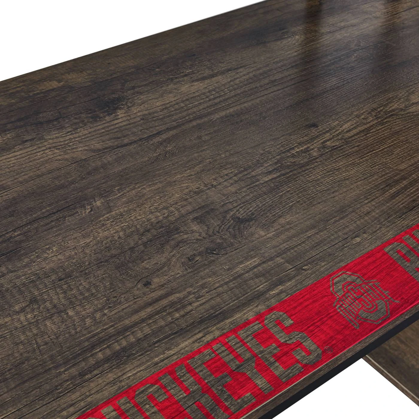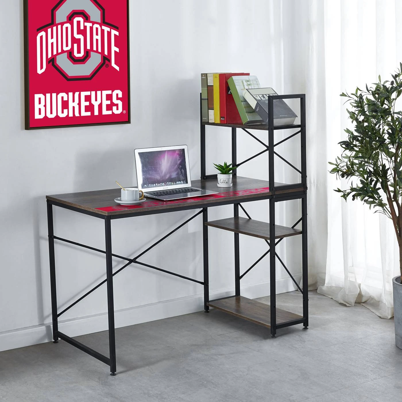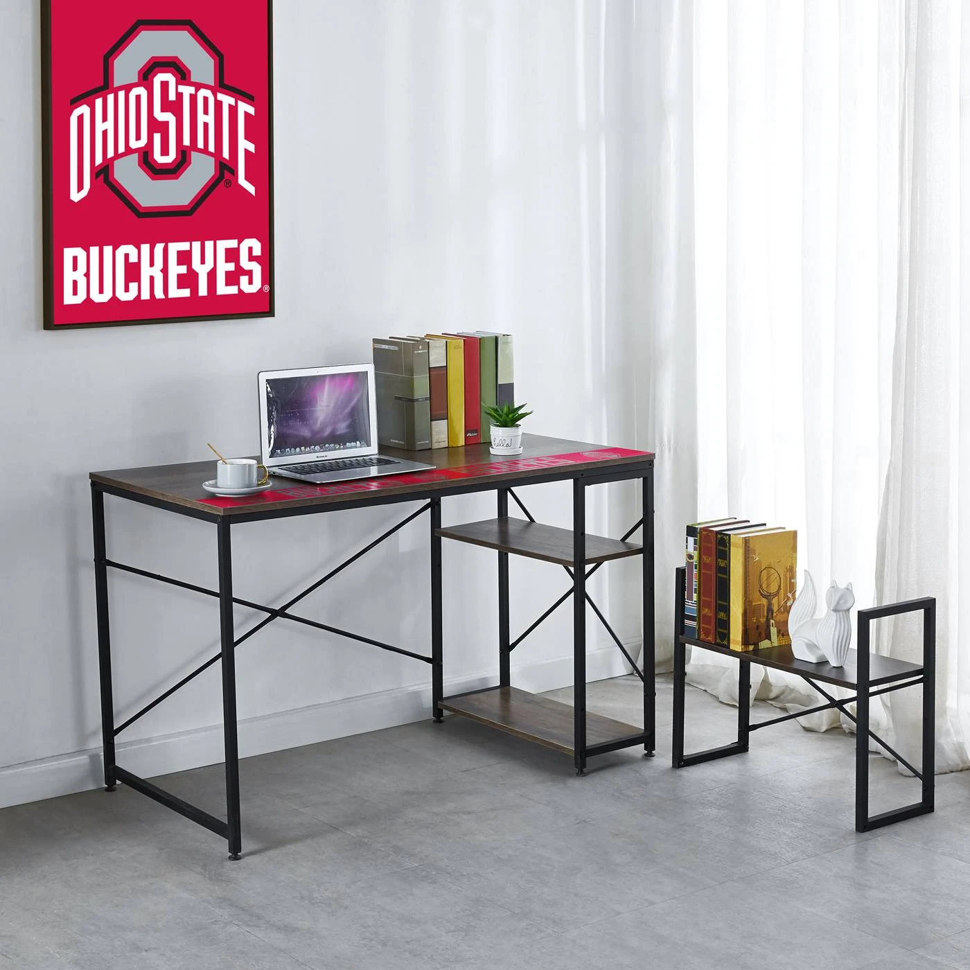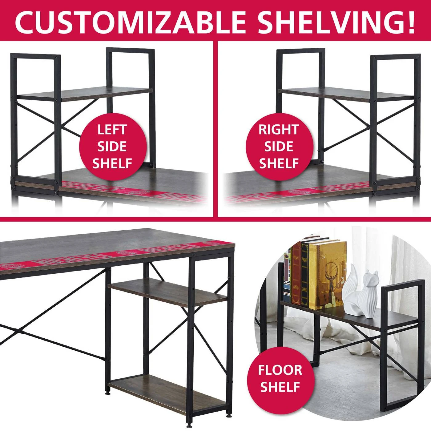 Customize your workspace with this great space saving desk with exclusive shelf design system. This Ohio State Buckeyes Office Desks unique design lets you customize shelves below and above the desk surface and +gives you plenty of space to stay organized. This industrial type look with a reclaimed desk top laminate blends well in all types of room decor. Perfect for writing and for use as a computer workstation.