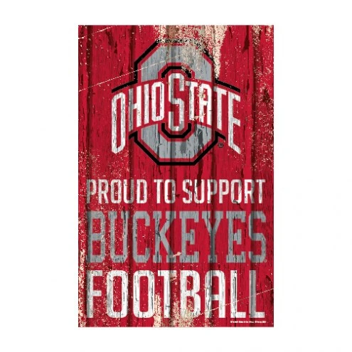 The Ohio State Buckeyes Proud to Support Wood Sign is 1/4″ thick, and decorated with quality graphics to resemble an antique wood finish. A matte finish laminate top is added for greater durability +and a precision cut smooth edge makes this a great indoor decor sign.