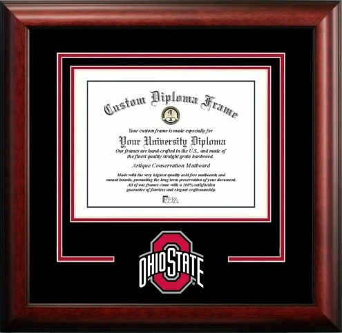 Show off one of your life’s greatest accomplishments with the Ohio State Buckeyes Spirit Diploma Frame. Customized to fit your diploma, this beautiful satin mahogany frame is going to look great in your +home or office. Matting is customized in school colors along with the school logo. Perfect for the graduate and fan! Everything you need to insert your document and hang the frame is included.