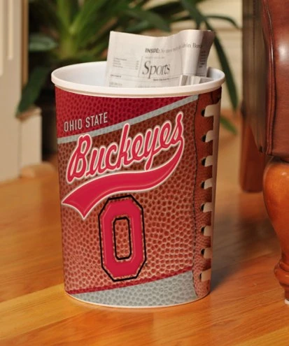 The durable Ohio State Buckeyes Trash Can features a two-sided design that is sure to show your team spirit at home or in the office. Add some team spirit to your own office, +or give this as a gift to any sports fan!