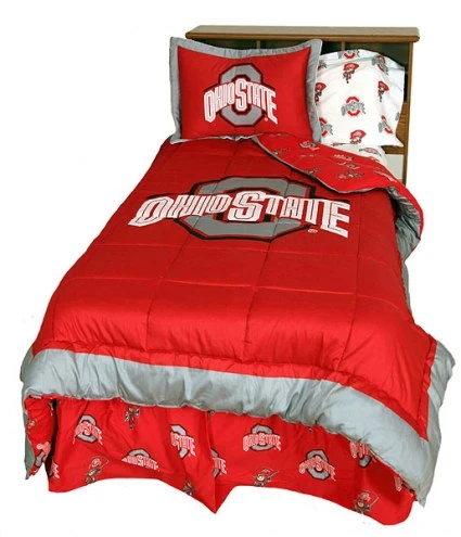Now you can decorate the bedroom in your favorite school colors! The Ohio State Buckeyes Comforter Set includes a reversible comforter, and sham(s). All items are 100% cotton sateen 200 thread count for +a softer feel than any other collegiate bedding available. Comforter has the University logo printed large on front with an all over logo pattern printed on the back giving you a truly reversible comforter with two unique looks. Twin size sets come with one sham, full, queen and king size with two shams.